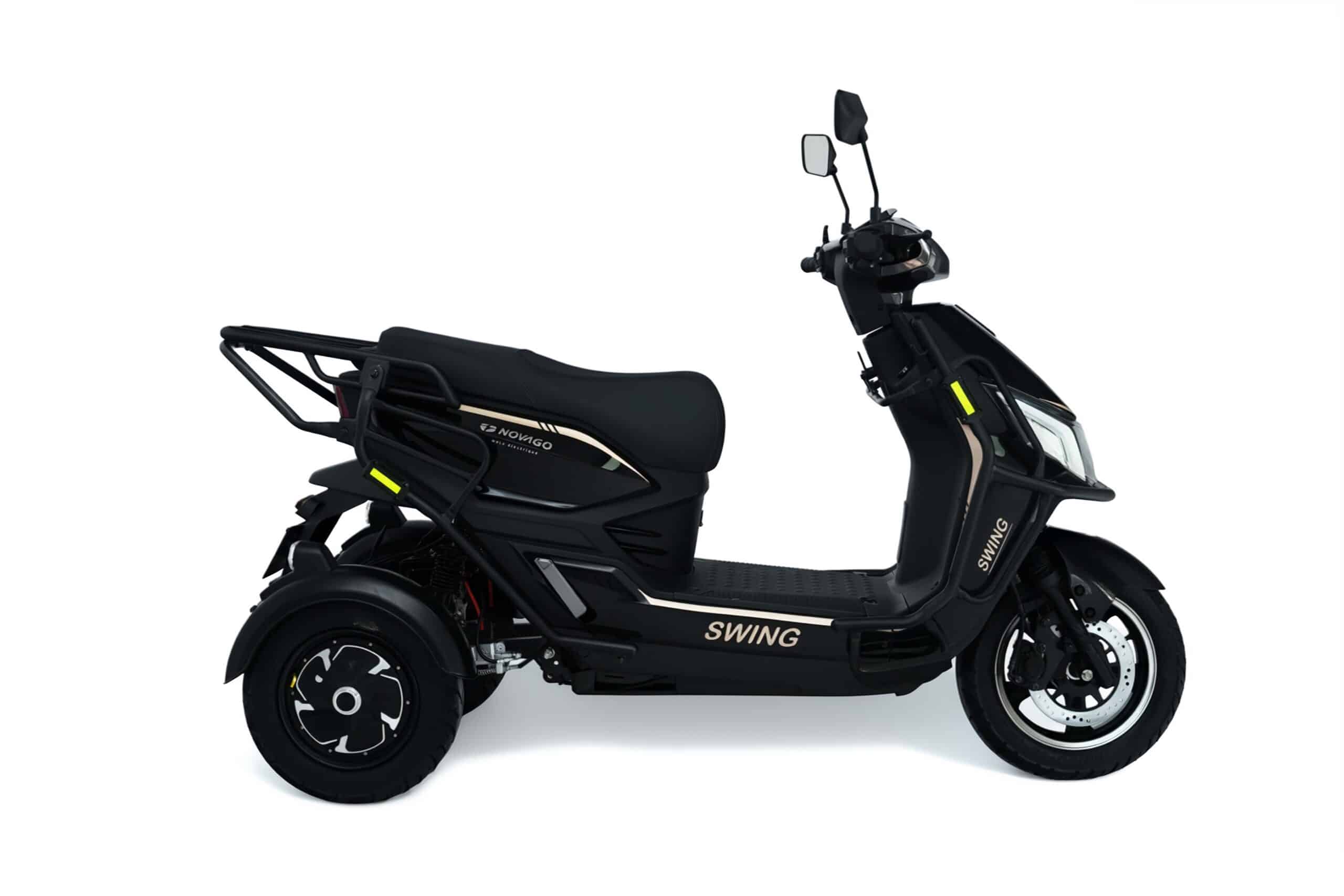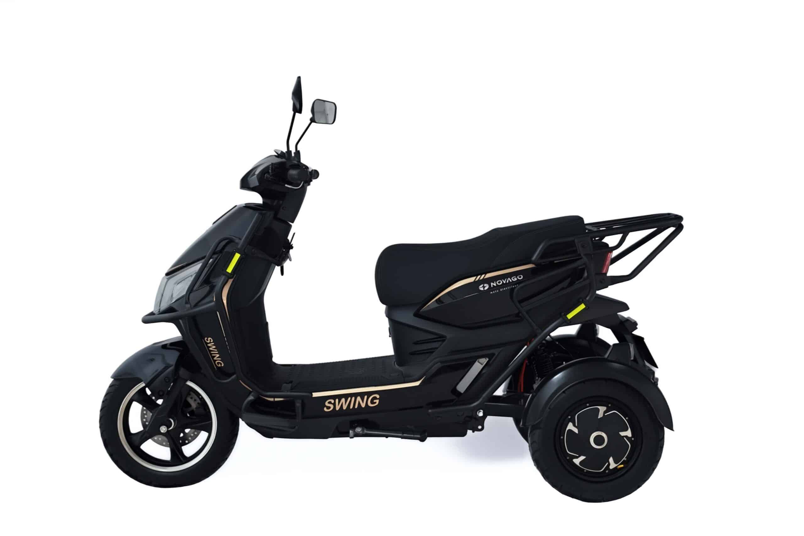Le NOVAGO SWING est équipé de pneus avant 90/90 R12 et pneus arrière 3.50 R10 (x2). Il peut supporter un poids maximal de 200 kg et dispose même d’une marche arrière intégrée, pratique pour les manœuvres en ville.